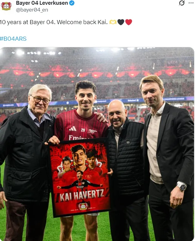 勒沃库森官推赛前欢迎哈弗茨回家,并且赛前还为哈弗茨送上了纪念品。